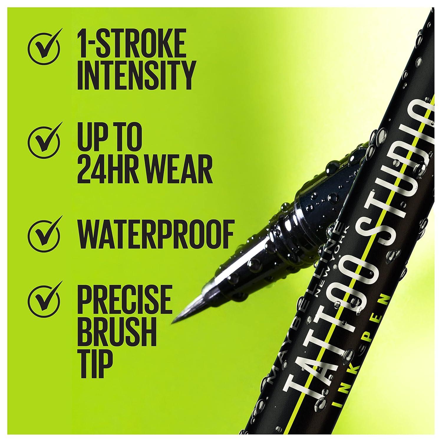 Meet Our Ink That Withstands It All: Maybelline Tattoo Studio Ink Pen Liquid Eyeliner is waterproof, fade resistant, smudge resistant and flake resistant. Black saturated pigments deliver intense impact with 1 stroke intensity and up to 24 hours of wear